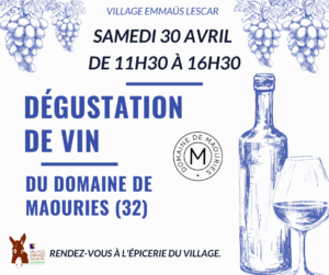 - Samedi 30 avril : Dégustation de Vin du DOMAINE DE MAOURIES à l’épicerie du Village Emmaüs Lescar-Pau de 11h30 à 16h30.