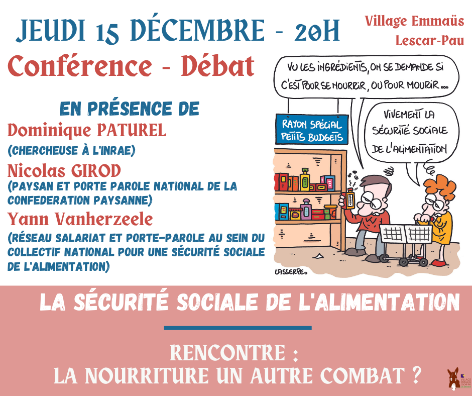 Jeudi 15 décembre à 20h, le village Emmaüs Lescar-Pau vous offre une conférence-débat sur la sécurité sociale de l’alimentation.
